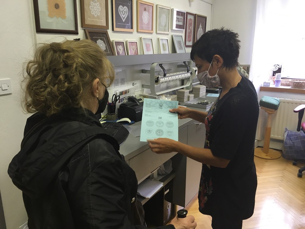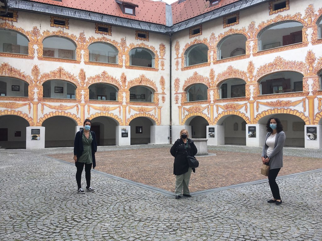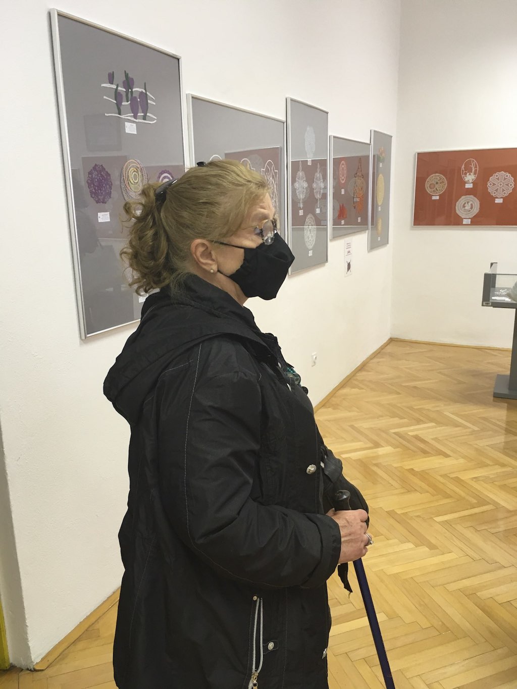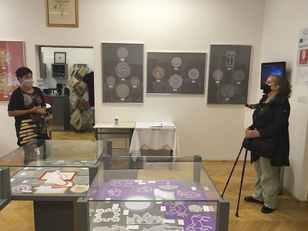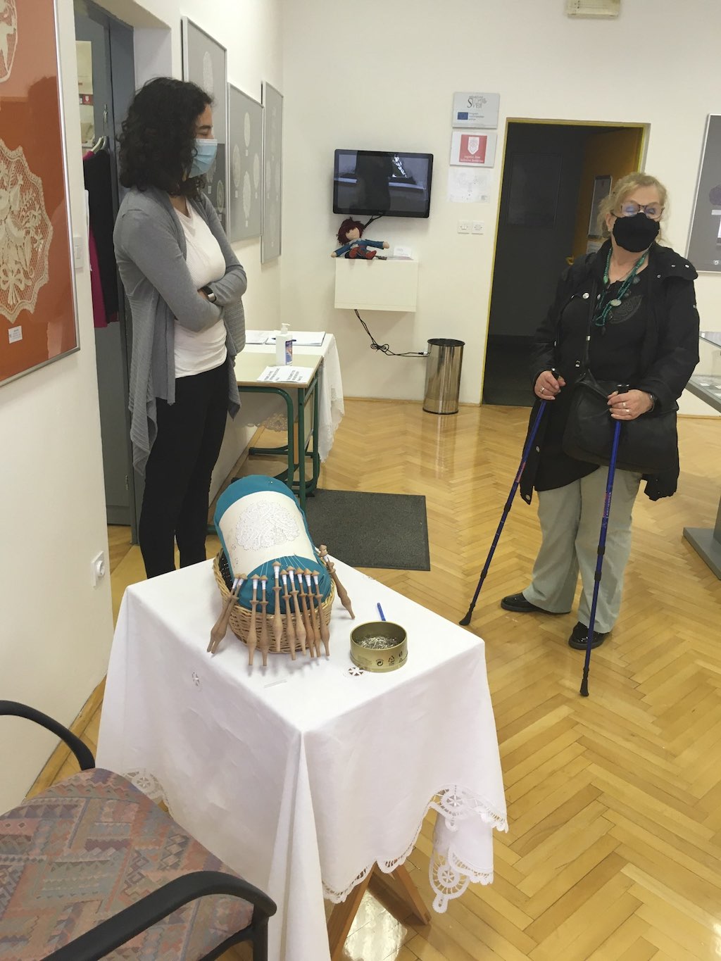 V mestni dnevni sobi so se na varni razdalji in z maskami malo podružile in poklepetale ter se nato odpravile na ogled klekljarske šole. Gospe je bila šola dobro poznana in kaj kmalu je to ugotovila tudi naša vodička. Ugotovili sta, da sta se že slišali po telefonu, ker gospa večkrat kaj potrebuje iz njihove trgovine. Vse tri so občudovale razstavljene čipke, od barvnih do tradicionalnih - belih in bež. Vse izpod rok učencev, otrok in najstnikov, ki se učijo te veščine. Tudi laično oko prepozna različne tehnike na umetninah in vse te je gospa Sonja že poznala. Prisluhnili smo pripovedi o zgodovini čipke, ki se lepo povezuje z bogato rudarsko zgodovino mesta.